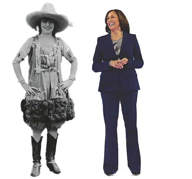 I felt like I’d been thrown back in time, to an era before the Wild West cowgirls, but as the years have passed, times have changed, and along with them our social mores, as evidenced by Kamala Harris campaigning for president in pants suits. When I saw her stride across that stage, it hit me what an accomplishment it was for America’s women that she was dressed in a pants suit. It was just one small step among many others, but still a step forward.
