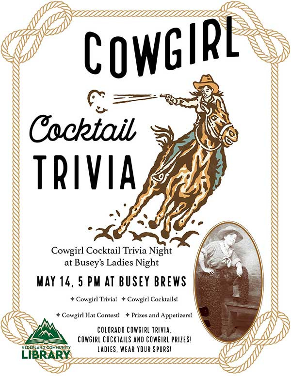 If you’re in the Nederland area on May 14, stop by Busey Brews for Ladies’ Night at 5 pm. The Nederland Library is hosting ‘Cowgirl Cocktail Trivia Night’! Prizes, special cocktails, and laughs guaranteed.